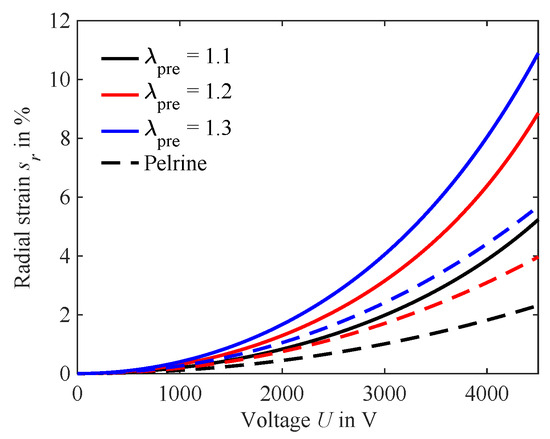 As described in Section 2.1, a typical approach is to calculate the radial strain of a circular DEA with Equation (4). The results of this calculation are compared against the hyperelastic model with constant force from Section 2.2 in Figure 9.