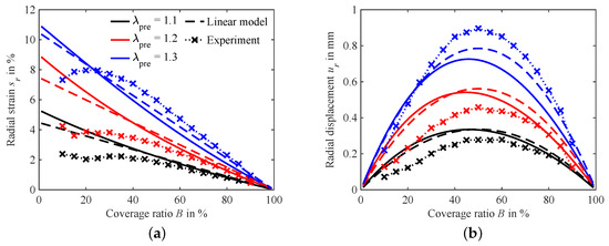 The calculated displacements depicted in Figure 10b also show only minor deviations, as expected due to the similar strain results of the two models. For the linear elastic lumped parameter model, the maximal displacement always lies at a coverage ratio , as is clearly deducible from Equation (23). In contrast, the maximum displacement in the hyperelastic model is shifted slightly towards coverage ratios lower than 50% for all modeled pre-stretch levels.