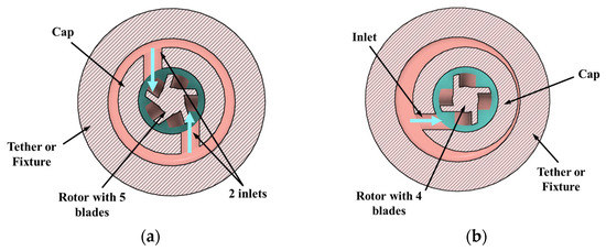 Figure 2a,b. Inlet diameter was 850 µm in design options 1, 3, and 4, and 400 µm in option 2. Nominal clearance between rotor and cap was 250 µm in all the designs.