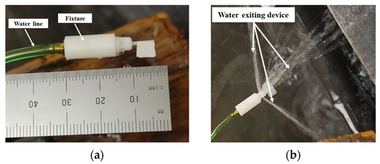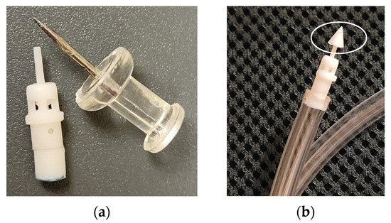 Because of the small size of the device (4 mm OD), it could not accommodate the inlet barb fitting for water connection. A fixture had to be designed to connect the waterline to the prototype as shown in