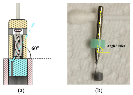 Figure 5b with a drill bit inserted into the inlet for visualization. During SLA printing, the holes were usually undersized, and the inlet hole had to be enlarged using the nearest drill size. The angle of the printed hole was used as a pilot for enlarging it. However, it can be seen in