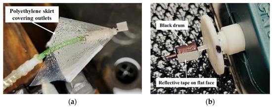 Figure 8a to overcome the issue of water splatter. It was hypothesized that the flag did not provide good contrast, i.e., dark vs. reflective regions for a strong signal (reflected laser) to be detected by the tachometer. To improve the repeatability of measurement, a flange was incorporated on the cap to divert the waterflow away from the retroreflective tape and the tape was attached to a flat face on the black cylinder, referred to as a “drum” (4 mm in diameter and 5 mm in height). This configuration is shown in