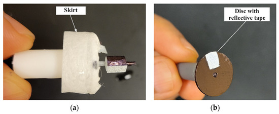 29], where a gear was used to intermittently reflect a laser. The number of times a reflective signal is detected depends on the number of gear teeth and the rotor speed. In our case, the disc (15 mm diameter, 1 mm thickness) was colored black and a single piece of reflective tape approximately 5 mm × 3 mm was glued along the radius. When using the disc, the tachometer was positioned on the marble block (
