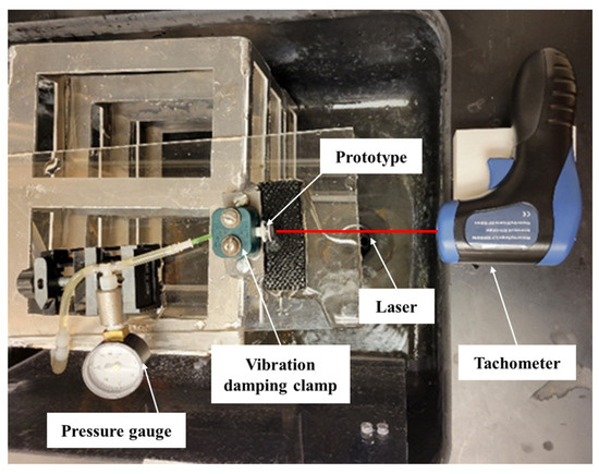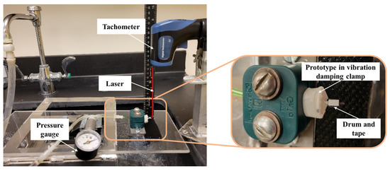 Figure 7a. A custom vibration damping clamp was used (part number: 3015T999; McMaster-Carr) to secure the device. There was very limited space for attaching retroreflective tape for angular velocity measurements using a handheld tachometer. The flag was sized approximately 5 mm × 5 mm to fit the laser spot. This configuration was tested first, since the RPM was successfully measured using a flag and drum in earlier experiments [