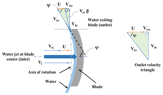 o with horizontal is β. If the blade angle is φ, the jet is deflected by an angle (180 − φ) degrees. Considering the velocity triangle at the blade outlet (