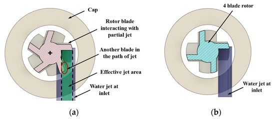 Figure 14b), the entire jet can be perpendicular to only one blade at the instantaneous position that produces peak torque. However, when the rotor is rotating, the next blade cuts into the jet’s path. For future designs, the relative position of inlet jet w.r.t blade, the inlet diameter and number of blades can be adjusted for optimizing the torque.