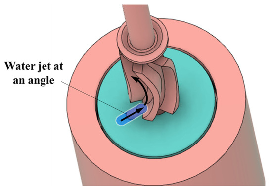 The jet inlet angle (α) is an important design parameter, and it can be calculated using the velocity triangles at inlet (Equation (8)). The known parameters are the blade angles (θ = φ), jet deflection angle (180 − φ), flowrate through the device, and the RPM of the rotor. V