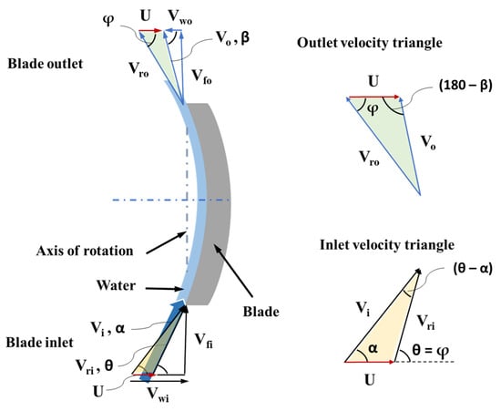 Figure 16 shows the velocity triangles at the blade inlet and outlet. The same notation as above was used for the velocities. Since the blade is symmetric, blade angle at inlet θ is equal to the blade angle φ at the outlet.
