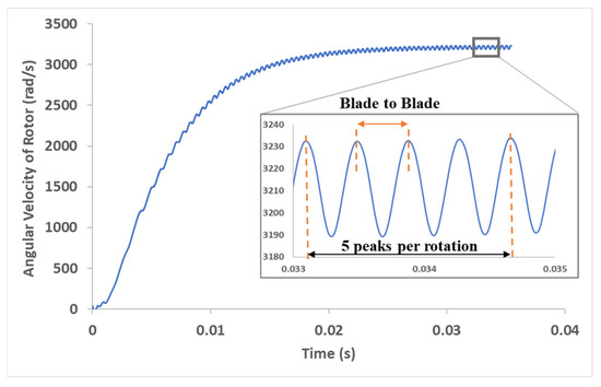 The average rotor angular velocity for a flowrate of 3.6 mL/s was 10,604.5 ± 159.1 RPM from the simulation for a torque of 9 µNm on the rotor. The corresponding experimentally measured value was 10,593.4 ± 778.8 RPM for the same flowrate.