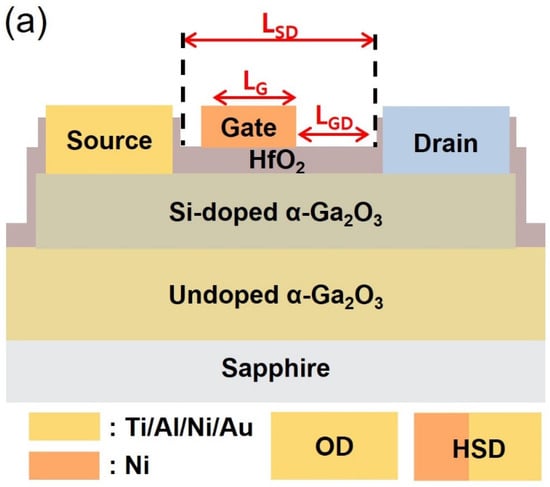 Power devices based on α-Ga2O3 represent another important application. Indeed, various α-Ga2O3-based device structures have been reported. For example, Schottky barrier diodes using mist-CVD-grown α-Ga2O3 films and α-Ir2O3/α-Ga2O3 hetero p-n junction diodes have been demonstrated [15,16]. Metal-semiconductor field-effect transistors based on a mist-CVD-grown α-Ga2O3 layer on sapphire were also proposed [17]. Jeong et al. reported an α-Ga2O3 MOSFET with a breakdown voltage (BV) of 2.3 kV grown via halide vapor-phase epitaxy (HVPE) [18]. Considering the demonstrated α-Ga2O3 devices’ structures, further enhancement of on-resistance (Ron) and breakdown characteristics can be achieved not only through a vertical structure but also through additional fabrication process steps such as surface passivation and field-plate structures [19,20,21,22,23,24]. Alternatively, the hybrid Schottky–Ohmic drain (HSD) scheme utilizing charge trapping in the Schottky extension region can be considered because of the relatively inferior crystal quality of heteroepitaxial α-Ga2O3 compared to the homoepitaxial Ga2O3 layer [25,26,27,28]. Indeed, the use of HSD on β-Ga2O3 FETs has been reported to alleviate degradation under thermal stress conditions [29].