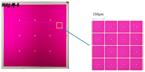 In this experiment, an integrated experimental platform was constructed. The platform consisted of a colorimeter, which could record the EWD’s luminance, and a voltage amplifier, which was used to amplify the driving voltage of driving waveforms [13]. In the experiment, the EWD used for testing was designed and manufactured by us, as shown in Figure 2. The oil color of the EWD was magenta. The panel size was 10 10 cm2 and the resolution was 320 240. The pixel size was 150 150 The height of the pixel wall was 18 . The thickness of the insulating layer and the electrode plate was 1 nm and 2.5 , respectively.