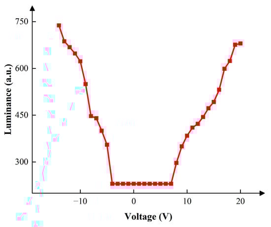 The corresponding relationship between the DC driving voltage and the luminance was measured as shown in Figure 4. The maximum luminance was 680 when 20 V positive DC voltage was applied. In this paper, the number of grayscales was set to four as an illustrative example, and the target luminance values of the four grayscales were set to 230, 330, 430, and 530. The target driving voltages were set to 0 V, 8–9 V, 12–13 V, and 15–16 V, respectively. Negative voltage was used to release trapped charges. The range of was set to 0 V, 4–5 V, 7–8 V and 8–9 V, respectively. The driving cycle was set to 20 ms because 50 Hz is a frequency which could be perceived by human eyes. was set to 5 ms. was set to 10 ms to drive the EWD at the maximum luminance. was set to 0.5 ms to release trapped charges, which could prevent oil backflow caused by charge trapping. was set to 15 ms. was also set to 15 ms to release trapped charges. The relationship between EWDs’ luminance and , in different grayscales is shown in Figure 5.