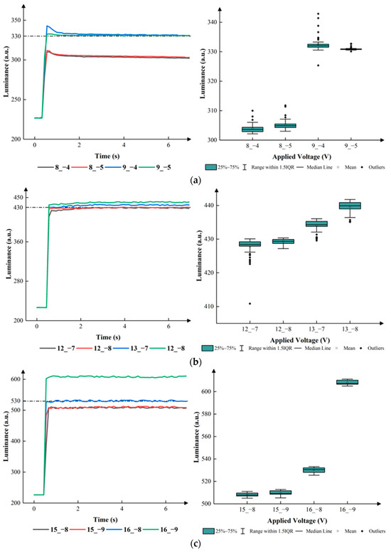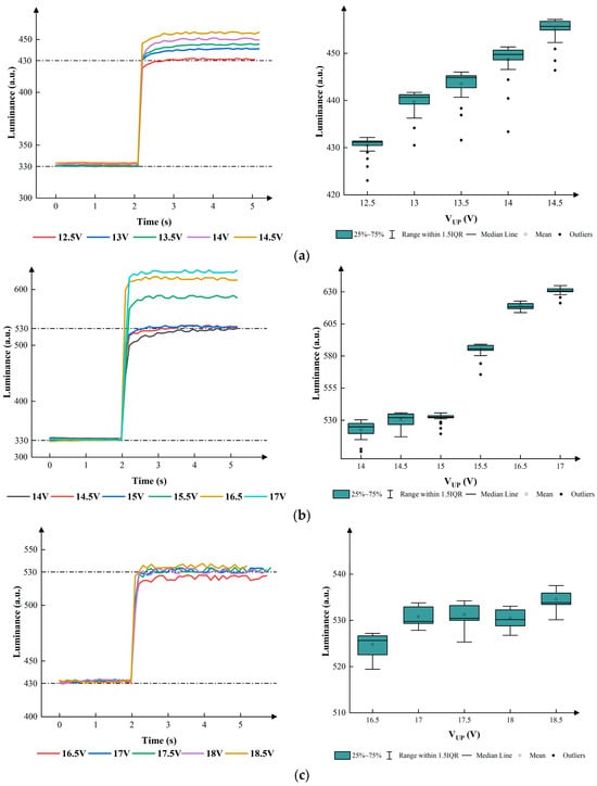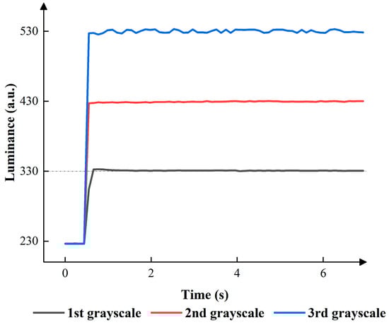 According to Figure 7, the change in luminance distribution was influenced by . In the process of conversion from the first grayscale to the second grayscale, the mean luminance values remained at 430, 440, 443, 448, and 457 when was set to 12.5 V, 13 V, 13.5 V, 14 V, and 14.5 V, respectively. The IQRs were 3, 7, 7, 8, and 6. In the process of conversion from the first grayscale to the third grayscale, the mean luminance values remained at 620 and 627 when the were set to 16.5 V and 17 V. It is evident that the converted luminance was much higher than the target luminance, which led to an unstable luminance and had an adverse effect on the process of conversions. Therefore, the were set to 14 V, 14.5 V,15 V, and 15.5 V. The mean luminance values remained at 528, 530, 531, and 589 when the were set to 14 V, 14.5 V,15 V, and 15.5 V. The IQRs were 15, 18, 4, and 7. In the process of conversion from the second grayscale to the third grayscale, the mean luminance values remained at 525, 532, 533, 531, and 534 when was set to 16.5 V, 17 V, 17.5 V, 18 V, and 18 V, respectively. The IQRs were 8, 6, 7, 5, and 4. Eventually, the best parameters could be obtained when the s were set to 12.5 V, 15 V, and 18 V in the three conversion processes.