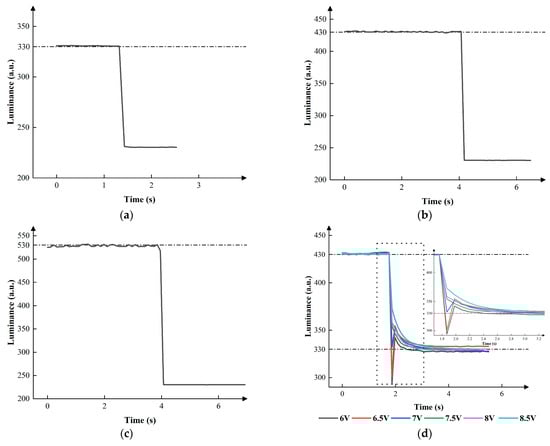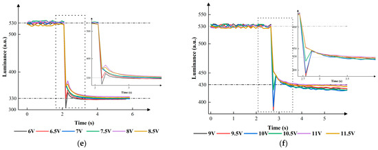 According to Figure 8, could affect the performance of EWDs. In the processes of conversion from other grayscales to the zeroth grayscale, the luminance nearly descended to 230. In the process of conversion from the second grayscale to the first grayscale, the luminance first swiftly dropped from 430 to less than 300, then rose to between 330 and 350, and finally stabilized at 330 when was set to 6 V or 6.5 V. The luminance first swiftly dropped from 430 to about 335, then rose to 350, and finally stabilized at 330 when was set to 7 V. The luminance first swiftly dropped from 430, then dropped slowly, and finally stabilized at 330 when was set to 7.5 V, 8 V, or 8.5 V. In the process of conversion from the third grayscale to the first grayscale, the luminance first swiftly dropped from 530 to less than 330, then rose to 345, and finally stabilized at 330 when was set to 6 V. The luminance first swiftly dropped from 530 to about 330, then rose to 353, and finally stabilized at 330 when was set to 6.5 V. The luminance first swiftly dropped from 530, then slowly dropped, and finally stabilized at 330 when was set to 7 V, 7.5 V, or 8 V. The luminance first swiftly dropped from 530, then slowly increased a little, and finally stabilized at 330 when was set to 8 V or 8.5 V. In the process of conversion from the third grayscale to the second grayscale, the luminance first swiftly dropped from 530 to less than 400, then rose to about 440, and finally slowly stabilized when was set to 9 V, 9.5 V, 10 V, or 10.5 V. The luminance first swiftly dropped from 530 to about 330, then slowly dropped, and finally stabilized at 330 when was set to 7 V. In summary, switching voltage could reduce the hysteresis effect, resulting in a faster grayscale conversion. Eventually, the best parameters could be obtained when s were set to 7.5 V, 7.5 V, and 11 V in the three processes of conversion.