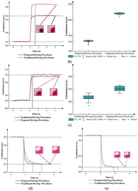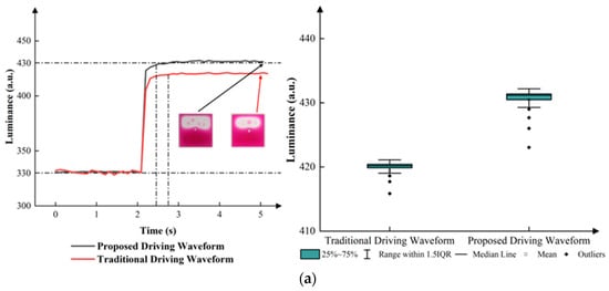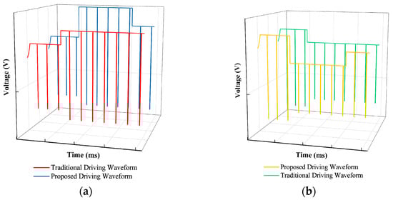Traditional driving waveforms were used to contrast the performance of the proposed driving waveform. Compared to the proposed driving waveform, the traditional driving waveform did not use and in the process of conversion. The luminance curves of the traditional driving waveform and the proposed driving waveform are shown in Figure 9.