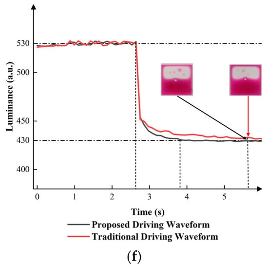 According to Figure 10, compared to the traditional driving waveform, the proposed driving waveform had a better performance. In the process of conversion from the first grayscale to the second grayscale, the luminance of the proposed driving waveform increased from 330 to 430 and remained at 430, while the luminance of the traditional driving waveform always remained at 420. In addition, the proposed driving waveform had a shorter response time. In the process of conversion from the first grayscale to the third grayscale, the luminance of the proposed driving waveform increased from 330 to 530 and remained at 530, while the luminance of the traditional driving waveform could remain at over 600. In addition, the proposed driving waveform had a shorter response time. In the process of conversion from the second grayscale to the third grayscale, the luminance of the proposed driving waveform increased from 430 to 530 and remained at 530, while the luminance of the traditional driving waveform always remained at about 525. Apart from this, the proposed driving waveform had a shorter response time. In the process of conversion from the second grayscale to the first grayscale, the luminance decreased from 430 to 330 and remained at 330, while the proposed driving waveform had a shorter response time. In the process of conversion from the third grayscale to the first grayscale, the luminance decreased from 530 to 330 and remained at 330, while the proposed driving waveform had a shorter response time. In the process of conversion from the third grayscale to the second grayscale, although the luminance decreased from 530 to 430 and remained at 430, the proposed driving waveform had a shorter response time. Overall, the proposed driving waveform decreased the response time of EWDs, resulting in an improved performance, as shown in Table 3.