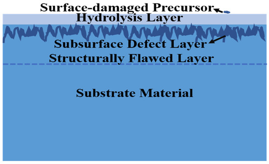 During the grinding and polishing of silicon lenses, monocrystalline silicon, being a brittle material, is prone to cracks, impurities, and other defects [16]. Figure 1 illustrates the common defect distribution of optical materials after grinding and precision polishing. Surface and subsurface cracks, as well as impurity metal elements, may be present. These defects can be suppressed as the level of processing increases, and a layer of hydrolysis forms below the surface of the element. In brittle materials such as monocrystalline silicon, the hydrolysis layer is a layer with a refractive index comparable to that of silicon, but amorphous [17,18,19,20]. Beneath the hydrolysis layer is a layer of subsurface crushing defects, which includes many scratches and cracks due to grinding and polishing, as well as a layer of defects enriched by polysilicon. Further below is a structural defect layer brought to the substrate by the grinding and extrusion process [21].