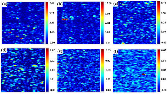 Photothermal weak absorption test plots of samples with different processes after wet and dry etching. Panels (a–c) show the dry etching of samples from the bonnet-polishing, chemical–mechanical polishing, and magnetorheological polishing processes, respectively. Panels (d–f) show the wet etching of samples from the bonnet-polishing, chemical–mechanical polishing, and magnetorheological polishing processes, respectively.