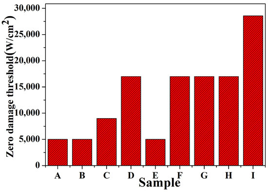 During our damage testing process, we set a requirement that the test energy step should not be less than 5, and each energy step test point should be 5. We recorded the highest energy density when no damage occurred and the energy density when damage occurred. We then calculated the average value of these two values for each point, which represents the damage threshold of the point. We averaged the damage threshold of all the test points to obtain the damage threshold of the sample. The sample testing environment was a class 10,000 clean room with a humidity of 45.6%. The laser-emitting surface was used as the sample-testing surface, and acetone and isopropyl alcohol were used to clean the sample surface before testing. During the damage test, the laser output wavelength was set to 3.8 μm, the pulse width was 25–35 ns, and the mode was TEM00. The laser energy was Gaussian-distributed, and the laser had to be warmed up for at least 15 min before the official test to ensure the stability of the output. The results of the damage threshold test are presented in Figure 7.