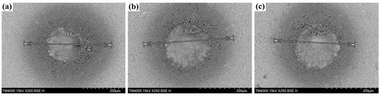 Figure 8 shows the morphology of the damage crater observed with a scanning electron microscope after the damage test. The size of the damage pits is marked in the figure. Our observation indicates that the damage occurred on the front surface of the sample, which is the incident surface of the laser. By comparing the damage morphology after different etching processes, we found that the optical element in the center of the laser spot underwent melting, followed by the production of solid particles around the melting area due to the process of melting and cooling after high-temperature treatment. The outermost edges also produced some spattering of the material during the laser action. The size and depth of the damage pits were significantly smaller in the etched sample than in the unetched sample. In summary, the damage is mainly due to the thermal melting phenomenon caused by the temperature in the center of the optical element during the laser-loading process, which exceeds the melting point of the material itself [50].