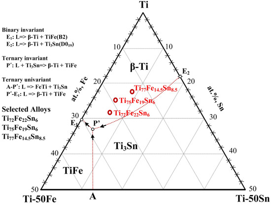 Figure 1 illustrates the Ti–Fe–Sn ternary phase diagram in the Ti-rich region, constructed using the previous experimental data [25,26,41]. The formation of the lamellar structure, comprising the -Ti + TiFe, is feasible through ternary univariant (A-P′) and quasi-peritectic reactions (L+ Ti3Sn => -Ti + TiFe). In this study, the focus was on eutectic–dendrite composites with compositions of Ti72Fe22Sn6, Ti75Fe19Sn6, and Ti77Fe14.5Sn8.5, which are highlighted as red dots in Figure 1. This particular region was chosen considering the inducement of -Ti dendrites, thoroughly demonstrating their intrinsic characteristics and contribution to mechanical properties. As shown in Figure 1, there are three possible dendrite phases in the Ti–Fe–Sn alloy system, such as -Ti, TiFe, and Ti3Sn. Among these primary dendrite phases, only -Ti is a solid-solution, which is expected to have a better ductility than the other intermetallic compound phases (TiFe and Ti3Sn) [25]. It is further anticipated that, as the composition approaches the Ti-rich region within the Ti–Fe–Sn ternary phase diagram, the volume fraction of the eutectic matrix and -Ti primary dendrites undergo gradual changes. A reduced yield strength is obtained with an increased volume fraction of the -Ti dendrite. Thus, the composition closer to the -Ti corner is favored. Hence, it is anticipated that a decrease in the volume fraction of the -Ti dendrite should be accompanied by decreased plasticity. Martensite phase formation can be induced by controlling the dendrite morphology, which, in turn, is induced by undercooling in the experiments conducted herein. Based on the results, it can be concluded that dendrite morphology is a key factor in the enhancement of plasticity.