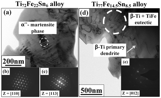 Figure 4 presents the TEM-BF images and SAED patterns of Ti72Fe22Sn6 and Ti77Fe14.5Sn8.5 ultrafine eutectic composites. The TEM-BF image and SAED pattern obtained from Ti77Fe14.5Sn8.5 eutectic composite with the largest volume fraction of the -Ti dendrite (Figure 4d,e) indicate the formation of a mixture of fine lamellar structures in a eutectic matrix and primary dendrite. The dendrite is identified as a -Ti phase from the SAED pattern indexed with the [012] zone axes (Figure 4e). Figure 4a shows the TEM-BF image of the Ti72Fe22Sn6 eutectic composite with the lowest -Ti dendrite volume fraction. Ti77Fe14.5Sn8.5 is known for a characteristic -Ti dendrite phase; in contrast, nano-scaled needle-shaped phases embedded in primary -Ti dendrite were observed in Ti72Fe22Sn6, as marked in Figure 4a. The chemical composition of the -Ti dendrite phases is 76.86 at. % of Ti, 15.22 at. % of Fe, and 7.92 at. % of Sn, which was estimated by the energy-dispersive X-ray spectroscopy (EDX) analysis. Five spots were investigated using EDS and an average was taken. In general, Fe has been known as a -Ti stabilizer and thus makes the -Ti phase stable at low temperatures [22]. To further identify the distribution of the phases, the SAED patterns are obtained from the primary dendrite (Figure 4b) and the needle-shaped phase (Figure 4c) regions. The results of the SAED pattern are identified as a -Ti solid solution with a [110] zone axis and the -Ti martensite phase with a [113] zone axis, indicating a mixture of -Ti and -Ti phases in the primary solid-solution dendrite. These experimental observations suggest that, becoming closer toward quasi-peritectic reaction points (P’) from the Ti-rich corner in the Ti–Fe–Sn ternary phase diagram (Figure 1), the concentration of Fe and its phases in the -Ti primary dendrite decreased with the increase in a lamellar structured matrix (-Ti +TiFe). Fe and its phases significantly contribute to the formation of the TiFe intermetallic compound layers in a matrix with the increase in TiFe diffraction intensity (Figure 2a). In highly alloyed Ti-alloy systems, which contain more than three elements, the structure of the -martensite becomes distorted, and the orthorhombic -martensite is formed during quenching. These trends of solidification result in the formation of a non-equilibrium -Ti martensitic phase in the Ti72Fe22Sn6 alloy [42]. Generally, the presence of an orthorhombic crystal structure, such as in -Ti, could improve the strength due to the higher stress requirement for plastic deformation with fewer slip systems than the BCC -Ti phase, but it also leads to a reduction in ductility with stress localization along the -Ti phase [43,44]. However, the Ti72Fe22Sn6 alloy, which contained the -Ti martensitic phase, shows a similar yield strength with larger plasticity compared to the Ti75Fe19Sn6 and Ti77Fe14.5Sn8.5 alloys, as shown in the SS curves in Figure 3. These results could imply that the presence of small volume fractions of -martensitic phase could not efficiently improve the yield strength, but it facilitates controlling the dendrite morphology, as exhibited in the SEM images [Figure 2b–d]. It can be deduced that the nucleation of the -martensitic phase in the -Ti dendrite hinders the directional growth of the primary dendrite, thus altering the morphology of the -Ti dendrite to be rounded, and it plays a prominent role in the enhancement of ductility.