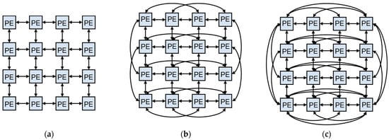 Firstly, there is a noticeable gap in research focusing on hardware attacks specifically targeting CNN accelerators. Existing hardware attacks have primarily focused on process elements (PEs), memory, and other components of CNN accelerators [,,]. However, there is a lack of studies investigating hardware attacks on the reconfigurable interconnection network. This network plays a crucial role in achieving accurate and efficient inferences in accelerators. Its function is to facilitate communication between PEs by connecting their data paths. The structure of the reconfigurable interconnection network is not fixed and can vary depending on the requirements of the application. It needs to strike a balance between flexibility and efficiency. Accelerators designed with this interconnection concept can leverage the advantages of reconfigurable computing architecture, such as low power consumption, high performance, and extensibility. Figure 2 illustrates three common reconfigurable interconnection network architectures used in reconfigurable processors. The MESH structure (Figure 2a) connects adjacent PEs and enables efficient execution of complex operations like matrix multiplication and inverse. The MESH_PLUS structure (Figure 2b) and the MORPHOSYS structure (Figure 2c) are extensions of the MESH structure that offer more flexible connections, allowing for a greater variety of operator mappings. In any type of reconfigurable interconnection network, the implementation relies on multiplexers (MUXs). MUXs select the appropriate data paths based on control signals. Reconfigurable CNN accelerators, such as Eyeriss [], Thinker [], and others [,,], employ MUXs to construct their interconnection networks. It is evident that the reconfigurable interconnection network, particularly the MUXs, is a fundamental module for achieving flexibility in reconfigurable CNN accelerators. MUXs ensure that the PE array can be configured to perform accurate computations. Therefore, hardware Trojan attacks targeting the reconfigurable interconnection network, especially the MUXs, can have detrimental effects on the prediction accuracy of CNN accelerators.
