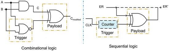 Secondly, the motivation for studying security issues in CNN accelerators is the scarcity of targeted countermeasures against hardware attacks. CNN accelerators play a critical role as decision makers in various AI systems. Therefore, once these accelerators become compromised, significant damage can be inflicted on the entire AI system. Traditional hardware attack methods can be adapted to target CNN accelerators, posing a serious threat to their security. Hardware Trojan attacks, in particular, are highly concerning. A hardware Trojan is a malicious design component that is covertly inserted into original circuits and can evade detection during conventional post-manufacturing tests. When triggered under specific conditions, the Trojan can leak sensitive information or manipulate the logic functions of the system. Hardware Trojan attacks can be categorized into combinational logic and sequential logic, depending on the type of circuits involved. Figure 3 illustrates the structure of a hardware Trojan, consisting of a trigger and a payload. In Figure 3, A, B, C are input signals and superscript * indicates the modified signal. The trigger activates the payload under rare conditions, allowing it to modify the original values. Various Trojan detection technologies have been proposed to mitigate the threats posed by hardware Trojans, but no single method can detect and eliminate all Trojans and their associated hazards [,]. Furthermore, existing studies lack adequate protection against hardware Trojan attacks specifically targeting CNN accelerators. Therefore, exploring countermeasures against hardware Trojan attacks is crucial. PUFs [] are functional circuits that rely on physical quantities, such as distance, time, and direction. PUFs leverage inherent process variations during manufacturing to achieve the unique functionality of generating a challenge–response pair (CRP) that is practically impossible to replicate in another device. PUFs have been utilized in various applications, including hardware-based security, anti-counterfeiting measures, and secure key storage. They offer a means to enhance device security by leveraging natural variations in the manufacturing process, making it difficult for attackers to replicate or forge device identities. Taking advantage of PUF techniques, this paper proposes a detection technique to protect the reconfigurable interconnection network from hardware Trojan attacks. This detection method can also be applied to safeguard similar structures with reconfigurable interconnection networks in CNN accelerators. By integrating PUF-based protection, the security of CNN accelerators can be enhanced against hardware Trojan threats, ensuring the reliability and trustworthiness of these critical components in AI systems.