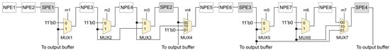 An FPGA-based CNN accelerator named RNA [,] features a reconfigurable interconnection structure designed specifically for accelerating neural network inference. This particular interconnection structure is commonly found in dynamic accelerators like Eyeriss [], Thinker [], and other similar accelerators [,,]. Figure 4 illustrates the architecture of the RNA accelerator. It comprises Normal Processing Elements (NPEs), which are responsible for carrying out multiplication and addition operations, and Special Processing Elements (SPEs), which additionally incorporate an activation function. When the activation function is not required, the SPEs can be switched to function as NPEs. The selection values of multiplexers (MUXs), denoted as m1–m7, control the data paths within the accelerator. By manipulating these MUXs, the PE array can be dynamically configured to support three computation modes, representing kernel sizes of 3 × 3, 5 × 5, and 11 × 11. Table 1 outlines the configuration words necessary for performing the three different kernel sizes mentioned above. To illustrate, consider the 3 × 3 kernel size mode. According to the configuration words for the first row in Figure 3, every two NPEs and one SPE form a subset within the PE array. In this case, m1, m3, and m5 are set to 0, while m2 and m6 are set to 1. Furthermore, m4 is set to 01, and m7 is set to 00. As a result, the PE array can be partitioned into four subsets for performing convolutional operations: NPE1, NPE2, and SPE1; NPE3, NPE4, and SPE2; NPE5, NPE6, and SPE3; and NPE7, NPE8, and SPE4. The reconfigurable interconnection network plays a crucial role in ensuring the correct computation of the PE array. Consequently, hardware Trojan attacks targeting this component can have detrimental effects on the prediction accuracy of CNN accelerators.