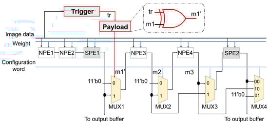 In our work, hardware Trojans are specifically implemented in a crucial component of CNN accelerators: the reconfigurable interconnection network. Figure 5 illustrates how a hardware Trojan modifies the selection value of MUX1 (m1) in this interconnection network. The trigger for this Trojan utilizes input images as the triggering condition, and the payload is designed with an exclusive or (XOR) gate to corrupt, when triggered, an internal signal. To demonstrate the impact of a hardware Trojan against CNN accelerators, we consider the example of performing convolution computation with a 3 × 3 kernel size. Theoretically, signal m1 should have a value of 0 when the kernel size is 3 × 3. However, when the Trojan is activated (i.e., tr signal is 1), signal m1 is modified to its opposite, m1′ under the action of the XOR gate. This modification causes the output of SPE1 to be connected with the input of NPE3. In other words, it introduces the output result of the first subset of PEs (NPE1, NPE2, and SPE1) into the second subset (NPE3, NPE4, and SPE2). As a result, the second subset of PEs generates an incorrect output value. Consequently, using this subset of PEs for convolutional computation leads to incorrect results. It is worth mentioning that hardware Trojans can also be connected to other MUXs, causing different types of attack consequences.