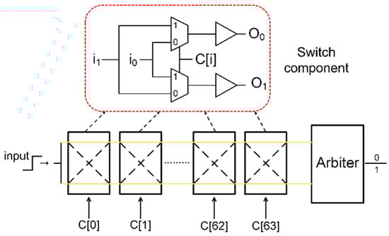 An arbiter-based PUF [] harnesses the statistical delay variation of wires and transistors across integrated circuits (ICs) to generate CRPs. This type of PUF comprises switch components and an arbiter positioned at the end of delay paths, as illustrated in Figure 6. The PUF consists of 64 switch components, and each switch component is represented by a red dotted line in the figure. Each switch component, implemented with a pair of 2-to-1 multiplexers and buffers, is composed of two input ports (i0 and i1), one control port (C[i]), and two output ports (O0 and O1). The fundamental idea behind this design is that the arbiter determines the speed of signal transmission along two symmetrical delay paths. The circuit takes 64 challenge bits (C[0]~C[63]) as inputs to configure the delay paths and generate a 1-bit response as an output []. If the signal traveling through the bottom path arrives first at the arbiter, the output response is set to 1; otherwise, the output response is 0.