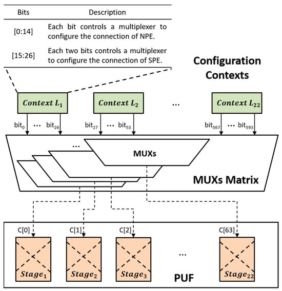 In the case of a hardware Trojan in a reconfigurable interconnection network, its impact is observed in the modification of control bits for the multiplexers (MUXs) among processing elements (PEs), specifically the configuration bits that influence the interconnection network. Once triggered, the hardware Trojan alters the interconnecting structure between PEs, leading to disruptions in data transmission and potentially causing calculation errors. To detect hardware Trojans in a reconfigurable interconnection network, a mapping technique can be employed. Figure 7 showcases the mapping of configuration contexts to an arbiter-based PUF. In this configuration, all the configuration contexts for 22 lines of PEs (represented as Context L1, Context L2, …, and Context L22) are connected to 64 challenge ports (C[0]~C[63]) through a MUX matrix. The matrix consists of 64 MUXs, each responsible for selecting one bit out of the nine or ten configuration bits.