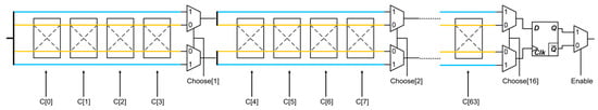 In order to defend against the proposed attack, a PUF-based countermeasure is designed, as shown in Figure 8. This countermeasure leverages the dynamic configurability characteristic of the reconfigurable chip to configure an arbiter-PUF using 2-to-1 multiplexers (MUXs) in the MUX matrix. The proposed design extends a traditional arbiter-based PUF by adding an additional 2-to-1 MUX to select the final output. By enabling this MUX, the countermeasure increases the possible output variations, making it challenging for an attacker to predict or crack the response and thereby enhancing the security level. Furthermore, all the switch components are divided into 16 sets, with each set containing 4 switch components. At the end of each set, a pair of 2-to-1 MUXs is employed to determine whether the current set is involved in the PUF. This configuration allows for flexible configuration of the delay paths. When the control bit choose[i] is set to 1, the delay paths bypass the current set, meaning that the input signal does not pass through the paths of that set. Conversely, for choose[i] = 0, the input signal traverses the delay path of that set. By utilizing this countermeasure design with the dynamic configurability of the reconfigurable chip, the circuit can effectively defend against the proposed hardware Trojan attack in the interconnection network, enhancing security and preventing potential disruptions in data transmission.