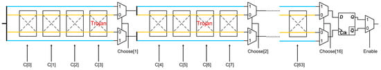 The PUF-based countermeasure offers two effective functions: detecting the presence of hardware Trojans and locating their positions within the interconnection network. For the first function, when hardware Trojans modify the control bit (C[i]) of the MUXs, the resulting delay path will differ from that without the modification. By applying constant challenges to the input signal of the PUF, a set of responses can be obtained. To detect hardware Trojans, these resulting response sets are compared with the original set. If there is a significant difference, it indicates the presence of hardware Trojans. For the second function, let us consider a scenario where the hardware Trojan modifies C[3] by placing a switch component. Under choose[1] = 1 (skipping the first set), the challenge–response pairs (CRPs) remain the same as the original CRPs. However, under choose[1] = 0, the CRPs differ from the original. This provides a clue to locate the position of the Trojan in the first set. Similarly, if hardware Trojans exist in multiple sets, a comparison of CRPs under different configurations can help identify the affected sets. Table 3 illustrates the possible results for Trojans in two sets in Figure 9. To summarize the process, when comparing CRPs under different cases, mismatches indicate the existence of Trojans within the corresponding sets. By controlling the choose signals and analyzing the CRP differences, it becomes possible to detect Trojans and pinpoint their specific positions within the interconnection network. This method remains valid for detecting Trojans in multiple sets by adjusting the choose signals and comparing the CRPs accordingly.
