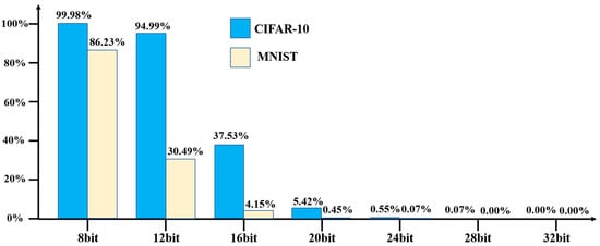 Stealthiness is indeed a crucial metric for evaluating attack mechanisms to ensure that triggering conditions stay hidden and evade suspicion from normal users. In the conducted experiment, 50,000 images from the CIFAR-10 and MNIST datasets were used to test the triggering results with different predefined triggering conditions. Figure 10 illustrates the percentage of original images from both datasets that successfully triggered the hardware Trojans. The results indicate that when using eight bits of the original images as the triggering condition, 99.98% and 86.23% of the images from CIFAR-10 and MNIST datasets, respectively, were able to activate the hardware Trojans. When the triggering condition was increased to 12 bits of image data, the proportion of images triggering the Trojans remained high, with 94.99% of CIFAR-10 images being successful triggers. However, the proportion decreased significantly for the MNIST dataset, with only 30.49% of the images triggering the Trojans. Continuing to increase the number of bits in the triggering condition to 16 bits resulted in a further decrease in the activation percentages for both datasets. For the CIFAR-10 dataset, 37.53% of the original images were successful triggers, while for the MNIST dataset, the percentage dropped to 4.15%. Using 20 bits as the triggering condition, the experiments showed a scarcity of images that could activate the hardware Trojans. Only 5.42% of the CIFAR-10 dataset and 0.45% of the MNIST dataset’s original images were successful triggers. Finally, when using 24 bits of image data as the triggering condition, it was observed that almost none of the original images from both datasets were able to activate the hardware Trojan payloads. It is evident from the experimental results that as more bits of image data are used as the triggering condition, it becomes increasingly challenging to trigger the hardware Trojans. Notably, almost no original images were able to trigger the Trojans with 28 or 32 bits of image data.