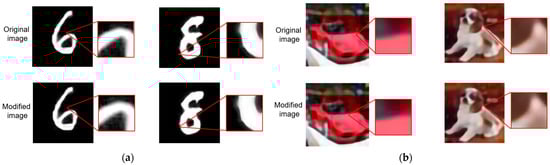 The comparison between original and modified images for different datasets: (a) the comparison between original and modified images for MNIST dataset; (b) the comparison between original and modified images for CIFAR-10 dataset.