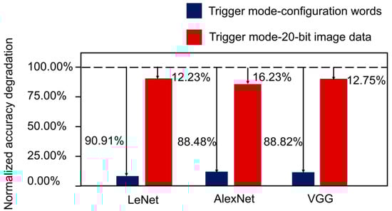 In assessing the attack effectiveness of the designed hardware Trojan attack, the degree of damage to accelerators is evaluated based on accuracy degradation. Table 4 presents the accuracy of the normal mode (no Trojans) and the triggering modes (activated Trojans). Figure 12 visualizes the results of the attack effectiveness, where the accuracy of different modes from Table 4 is normalized with respect to the normal mode. First, the attack effectiveness of using model configuration words as the triggering condition is evaluated. This scenario represents the maximum attack effectiveness of hardware Trojans in a reconfigurable interconnection network. The experimental results demonstrate that the attack is highly effective, resulting in accuracy degradations of 90.91% for LeNet, 88.48% for AlexNet, and 88.82% for VGG. Next, the attack effectiveness of using 20-bit image data as the triggering condition is evaluated. The results indicate that the attack reduces accuracy by 12.23% for LeNet, 16.23% for AlexNet, and 12.75% for VGG. These accuracy degradations highlight the considerable attack effectiveness of the proposed hardware Trojan attack. By modifying the data path, the hardware Trojans lead to misconfiguration of the arithmetic circuit, thereby impacting the accuracy of the accelerator. Overall, the experimental findings demonstrate that the designed hardware Trojan attack has substantial attack effectiveness. The modifications made by the Trojans, which alter the data path, directly contribute to the misconfiguration of the arithmetic circuit, resulting in significant accuracy degradation in the system.