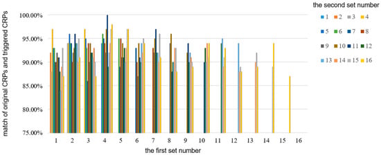 Table 6 presents the experimental results for the first case, where a Trojan is injected into the first set in advance. In this case, the enable signal is set to 1 to select output Q, and only one of the “choose” signals is set to 1 while the other signals are set to 0. This configuration allows the skipping of the set where “choose[i] = 1”. The results show that when the first set is skipped, the comparison of CRPs remains the same as the original CRPs, indicating that the delay path is not altered. However, for the remaining sets, the CRP comparison does not yield a 100% match. This indicates that the delay path is modified when these sets are skipped, suggesting the presence of a Trojan in those sets. By observing the differences in the CRP comparisons, it can be concluded that a hardware Trojan exists in the first set. In the second case, Figure 13 illustrates the comparison between the original CRPs and the triggered CRPs. In this experiment, any two sets are selected to be skipped, resulting in a total of 64 possible combinations. The x-axis in Figure 13 represents the first set number, while the bars represent the second set number that is skipped. For example, the red bar at the x-axis 1 represents the first and eighth skipping sets. Similar to the first case, the enable signal is set to 1, and two “choose” signals are set to 0 while the remaining signals are set to 1. When the fourth and eleventh sets are skipped (represented by the purple bar at the x-axis 4), the comparison between the original CRPs and the triggered CRPs shows no difference, indicating a 100% match. This result suggests that the delay path remains unchanged when these two sets are skipped, implying that the components in this delay path do not contain any Trojans. However, when other sets are skipped, the comparison results differ, indicating the presence of hardware Trojans in those specific sets.