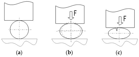 Behavior of the ball under force F: (a) initial situation; (b) ball compression; (c) the appearance of a first crack in the compressed ball.