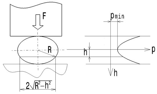 The variation in the pressure, p, along the direction of the compression force, F, exerted on the ball of radius R can be determined as a ratio between the magnitude of the force, F, and the surface area of the sphere in a plane perpendicular to the direction of force F and located at a distance, h, from the sphere center (Figure 2). In a plane parallel to the equatorial plane and at a distance, h, from this equatorial plane, the radius, r, of the resulting circular surface determined by sectioning the sphere can be determined using the relation: