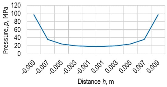 As an example, assuming a value of the force F = 5750 N (corresponding to one of the values of F at which the first crack appeared in the case of a ball made of the granite-type material the pressure, p, variation along a direction parallel to the direction of the axial force F can be observed in Figure 3. More detailed explanation will be provided in the experimental part on the research. The observation of how the crack appeared was performed visually and practically by the force–deformation diagrams developed using the computer program of the tensile–compression testing machine. At the time of the crack, there was a sudden drop in the magnitude of the force, F, applied to the ball.