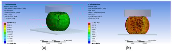 Analysis settings considered a one-step-in-time of 0.001 s with automatic mass scaling. According to the experimental results, the mean value of 3.23200 kN was used as the compressive load at maximum compressive extension for the 50% concrete filament, and the table on which the ball stood was considered fixed. The results are consistent with the experimental ones. Strain registered as 0.64797 mm/mm as opposed to 0.60698 mm/mm in the experiments (see Figure 4a). Under the compressive load, the sample flattened at both ends, and the crack was similar in shape and the direction of propagation to that of the experimentally tested. Stress registered as 12.093 MPa as opposed to the value of 10.28777 MPa obtained in the experimental tests (see Figure 4b). A section view presents a detailed stress distribution as the core of the sample crumbles to pieces, thus initiating the appearance of the crack.