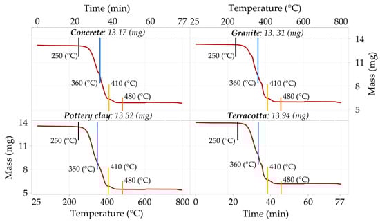 The thermogravimetric analyses were performed using TGA 2 equipment from Mettler Toledo (Columbus, OH, USA). Samples of PLA with concrete, granite, pottery clay, and terracotta reinforcements were heated in the equipment furnace at 10 k/min using a purge gas flow rate of 50 mL/min. At 600 °C, the purge gas was switched from nitrogen to air. The degradation of the PLA mass stars near 250 °C flowed by a significant material loss due to pyrolysis up to 480 °C.