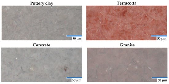The diagram in Figure 10 highlights that, from the point of view of the force value required for the appearance of the first crack, the ceramic composite materials with a polymer matrix are arranged in ascending order in the following way: pottery clay, granite, concrete, and terracotta. This means that the highest mechanical strength among the ceramic composite materials corresponds to the terracotta-type ceramic composite material.