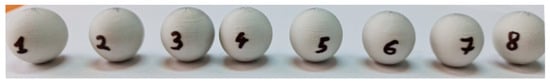 The verification of some of the previously formulated hypotheses and the accumulation of additional information regarding the behavior of ball bodies under the action of compression stresses was carried out by manufacturing balls with a diameter of 20 mm from four distinct ceramic–polymer composites (FromFutura PLA Pottery clay, FormFutura PLA Terracotta, FormFutura PLA Granite, and FormFutura PLA Concrete; manufacturer: FormFutura, The Netherlands).