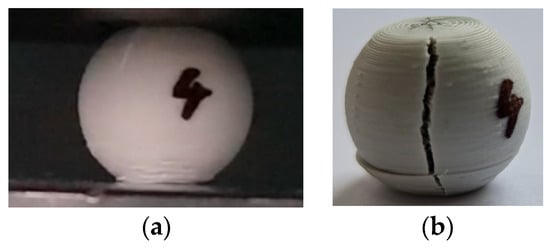 Figure 3 shows that the maximum pressure values will be reached in the upper and lower areas of the ball, where there is the highest probability of an initial crack. However, the balls were manufactured by 3D printing. In the lower area of the ball, where the printing process started, the balls have a small, flat surface due to the contact of the molten material with the table of the printing equipment. Such a situation contributes to the appearance of a deviation from the spherical shape in the lower area of the ball. On the other hand, the balls may present a small protrusion in the upper area where the printing process has ended. This situation leads to lower values of the surface on which the compressive force, F, is applied or higher values of the pressure, p, in the upper areas of the balls. Consequently, the first cracks are expected to appear in the upper areas of the balls.