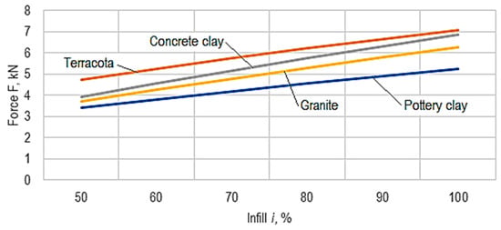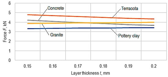 For three materials (an exception being the terracotta-type material), the increase in the layer thickness causes a decrease in the force, F, more significant in the case of concrete and less in the case of pottery clay (Figure 12).