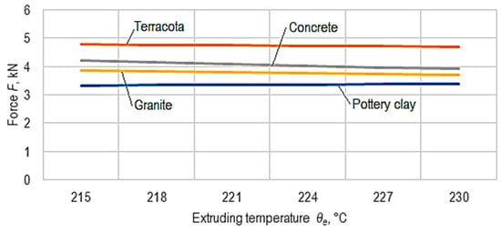 Except for the pottery clay material, the increase in the extruding temperature, θe, reduced the force, F, the most significant reduction occurring in the case of the concrete-type material (Figure 11). An explanation of this reduction could be connected to a deformation less favorable to the mechanical resistance of the wire deposited to constitute each layer in the case of the 3D printing process when the temperature, θe, increases for three of the ceramic composite materials from which the balls were made. An inverse behavior (an increase in force, F, with increasing temperature, θe) was observed in the pottery clay-type ceramic composite material, which showed the lowest mechanical resistance (Figure 11).