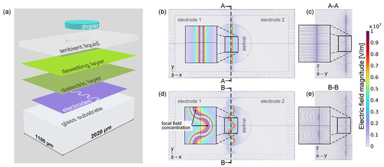 The setup for the electric field simulation includes a bottom glass of EAGLE XG, the electrodes with wave-shaped or straight contours, a dielectric layer of Exilis, a dewetting layer of PTFE, a compressed droplet of ethylene glycol and the compressed ambient medium (diphenyl sulfide), see Figure 2a. All generated geometric regions are assigned a thickness and relative permittivity according to Table 3 corresponding to the physical setup.