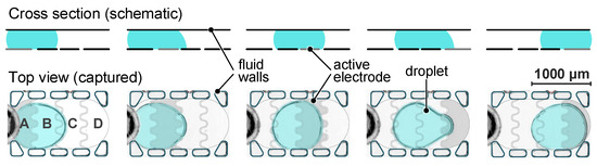Driving voltages of the rectangular signal for the droplet motion were , corresponding to a peak-to-peak voltage of and thus considerably lower than reported for comparable LDEP devices [14,31,43,44].